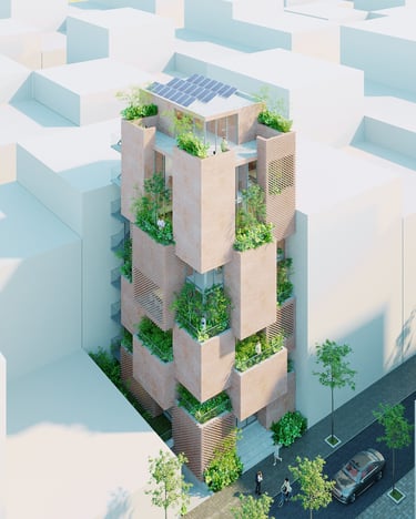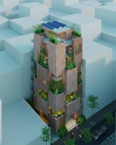 Là công trình nhà ở kết hợp văn phòng tại Hà Nội, dự án gồm 5 tầng văn phòng phía dưới và 3 tầng nhà ở phía trên, với diện tích ở khoảng 300m². Thiết kế theo định hướng sống xanh và bền vững, lấy cảm hứng từ kiến trúc truyền thống, với các khu vườn xen kẽ xếp chồng, thông gió tự nhiên và tích hợp năng lượng tái tạo. Mặt bằng tổ chức tối ưu theo vi khí hậu bản địa. Công trình kết hợp vật liệu địa phương như gốm, giấy dó cùng kỹ thuật hiện đại, vừa tạo bản sắc kiến trúc, vừa thúc đẩy làng nghề. Hệ cửa nhôm kính Tostem được lựa chọn nhờ ngôn ngữ tối giản, khả năng cách nhiệt, cách âm và chống bụi vượt trội, góp phần hoàn thiện không gian sống bền vững và kết nối với tự nhiên.
