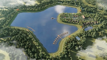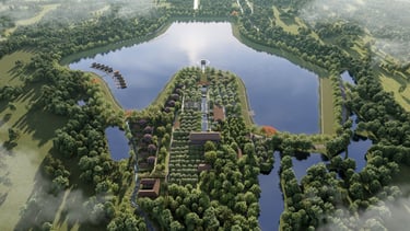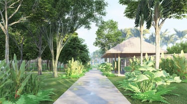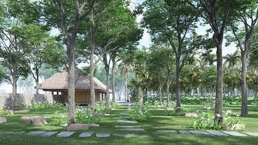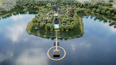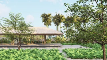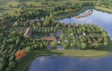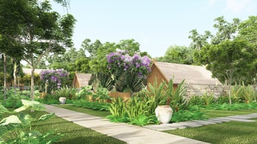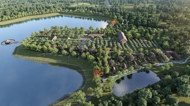Toàn bộ không gian chức năng được bố trí xoay quanh phần lõi trung tâm – một vòng tròn cảnh quan lớn đóng vai trò không gian đệm và định hướng, kết nối mềm mại các khu vực sử dụng khác nhau trong tổng thể resort.