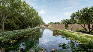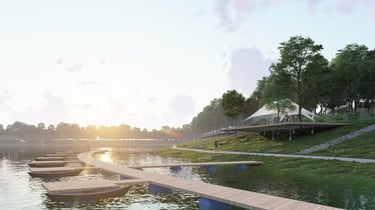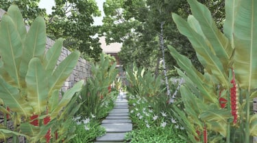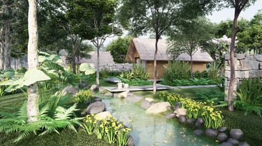 Người sử dụng sẽ được dẫn dắt từ rìa khu đất qua những bức tường đá tự nhiên, bước vào không gian rừng nguyên sinh, sau đó khám phá dần các lớp vườn đóng–mở đa dạng, trước khi tầm nhìn mở hẳn ra mặt hồ phía cuối trục.