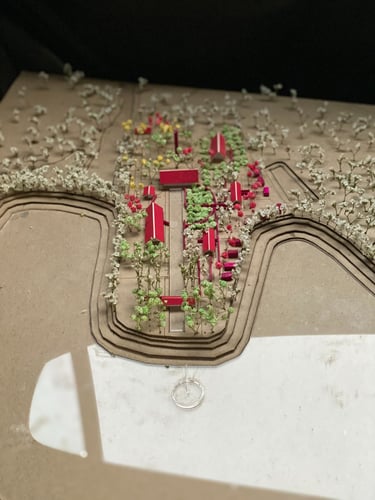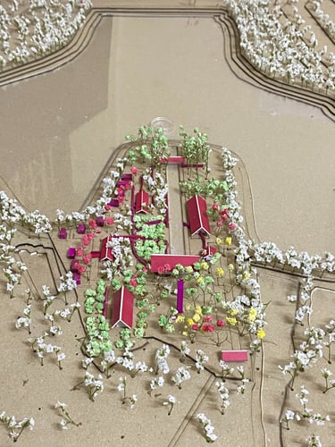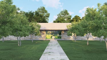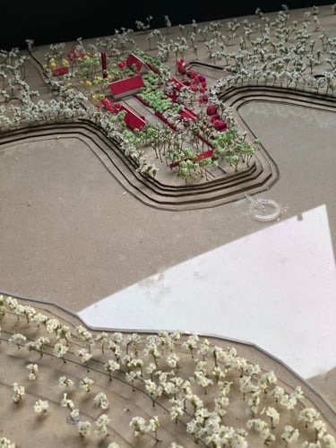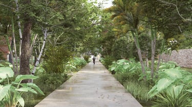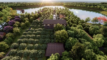 Dọc theo trục này, cảnh quan được chia thành các lớp trải nghiệm chuyển tiếp, bắt đầu từ phía Đông với không gian rừng nguyên sinh phục hồi – nơi được trồng đa tầng tán để tái tạo hệ sinh thái và thu hút chim bản địa. Tiến dần về phía Tây, cảnh quan chuyển tiếp sang vườn cây ăn quả hiện trạng, mở tầm nhìn dần về phía hồ.
