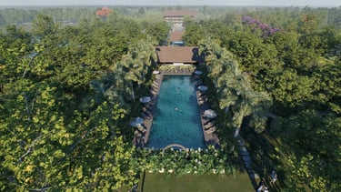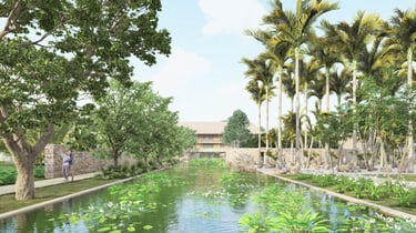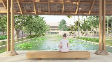 Công trình được quy hoạch xoay quanh một trục cảnh quan chính kéo dài theo hướng Đông – Tây, đồng thời là trục tổ chức không gian mặt nước nằm giữa khu đất. Không chỉ đóng vai trò liên kết các không gian chức năng, trục mặt nước này còn giúp dẫn luồng gió mát từ hồ vào sâu bên trong khu đất, tạo vi khí hậu dễ chịu cho toàn bộ khu nghỉ dưỡng.