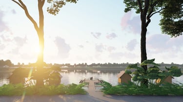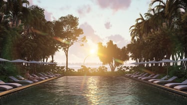 Các không gian chức năng được phân chia rõ ràng giữa hai khu vực “động” và “tĩnh”, bố trí đối xứng qua trục mặt nước trung tâm: khu “động” (nhà hàng, bar, café) hướng đến hoạt động cộng đồng; khu “tĩnh” (bungalow, condotel) ưu tiên sự riêng tư và nghỉ dưỡng. Trục cảnh quan không chỉ kết nối mà còn đóng vai trò ranh giới tự nhiên điều tiết không gian và khí hậu.
