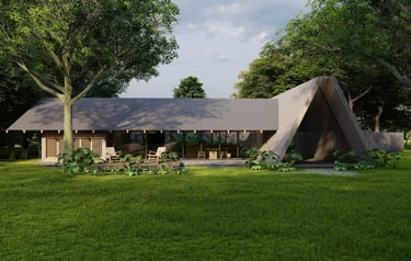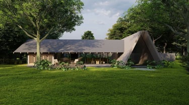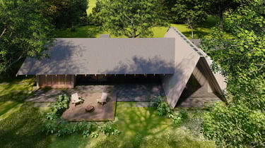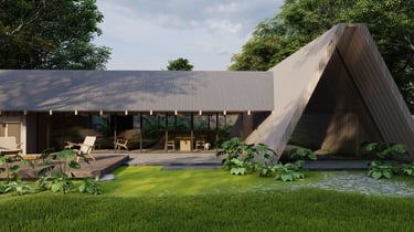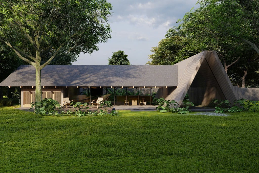 Ý tưởng thiết kế dựa theo cấu trúc nhà truyền thống với 2 không gian đóng 2 bên ( không gian ngủ, thờ ) được kết nối với nhau thông qua hệ mái dốc, hàng hiên tạo nên không gian mở ( không gian sinh hoạt chung) nằm ở giữa. Từ đó giúp tăng sự tương tác, kết nối giữa các thành viên trong gia đình, và kết nối với thiên nhiên.